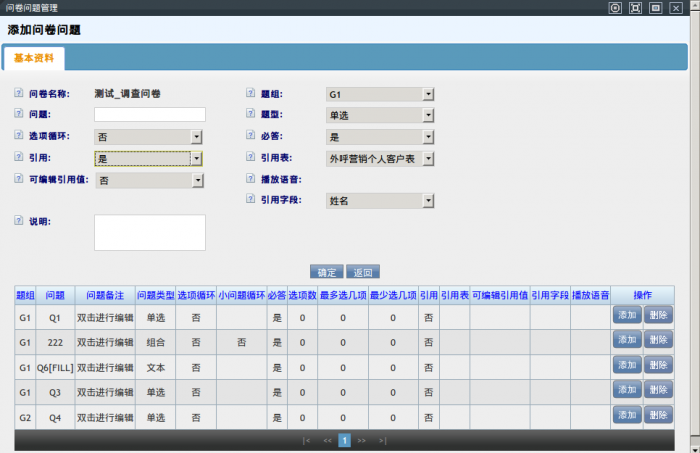 引用表:作答客户来源于哪种类型表,共有三个选项(外呼营销个人客户表,外呼营销机构客户表,虚拟呼叫中心客户表),实际可以分为两类(外呼营销,虚拟呼叫中心)。根据问卷用于哪个模块,以及客户类型选择目标表。(注意:当问卷被指定模块任务选定后,此处默认帮你选中引用表。如果问卷暂时未被任何业务选择,需要你根据业务需要手动选择表)