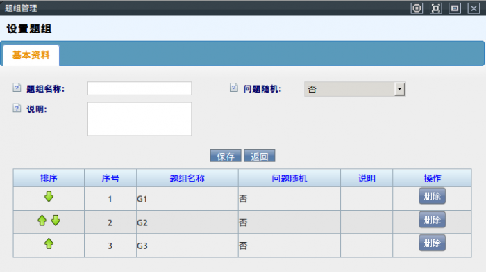 保存后,题组出现在下方的表格内,你可以对题组进行排序。序号越小,该题组下的问题越优先作答。