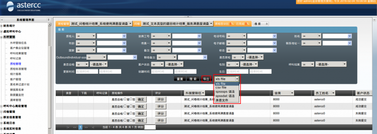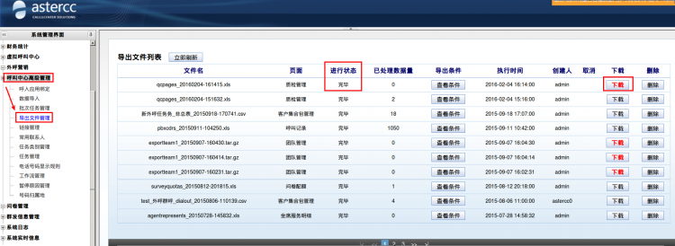 导出任务建立后,系统会告知你一个任务编号即文件名,凭此文件名到呼叫中心高级管理模块下导出文件管理页面进行下载。