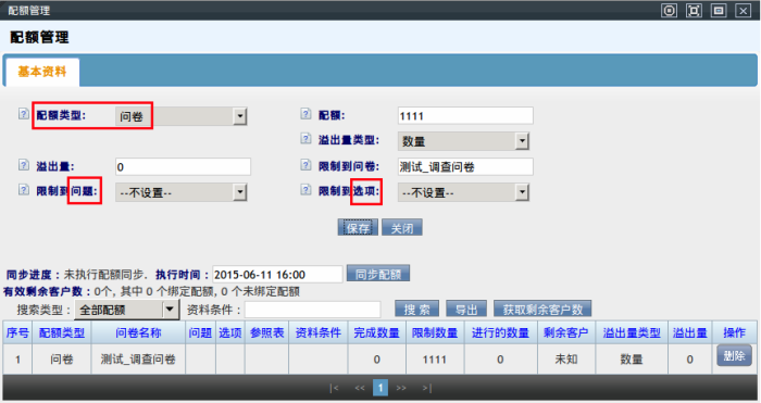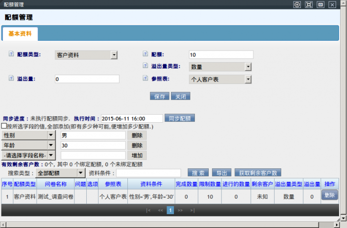 同步配额:仅限于客户资料类型的配额使用,把配额设置同步到客户资料中,保证坐席仅获取符合配额的客户进行访问。