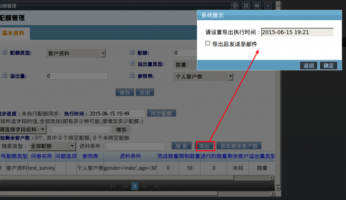 导出配额:点击导出按钮,填写导出执行时间,将问卷下所有配额设置写入excel中,供管理者查看。