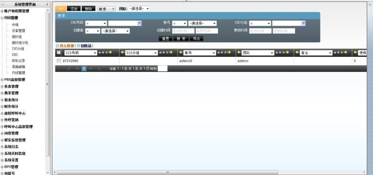 点击左侧菜单的 PBX管理 → DID,进入管理页面,点击“添加”按钮,系统将弹出添加的窗口,如图所示