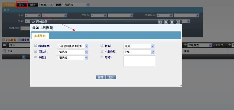 数据填写完毕后,点击【保存】按钮进行数据保存。在主叫号码限制页面可以看到新增加的数据。