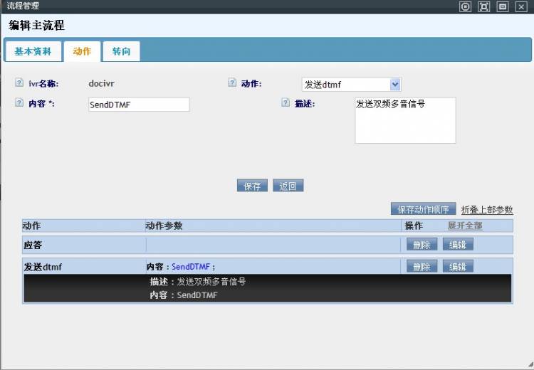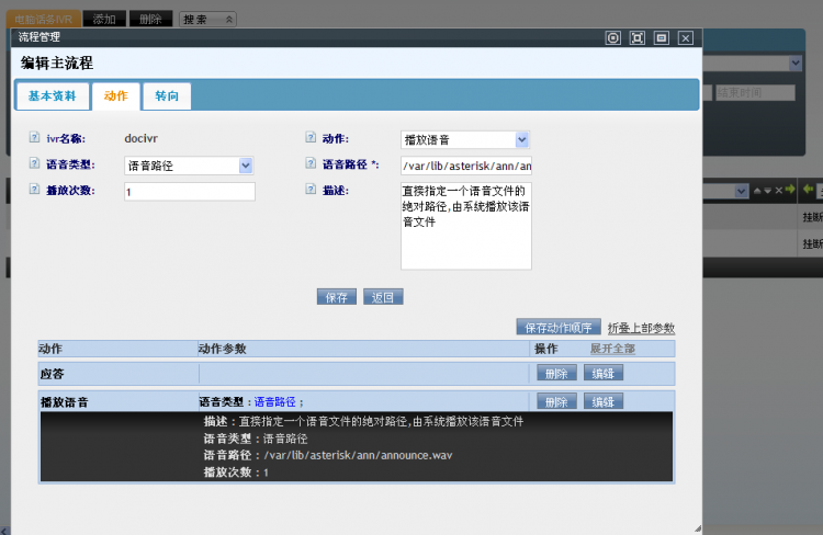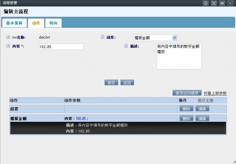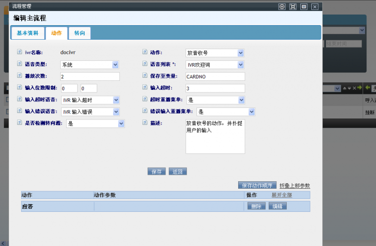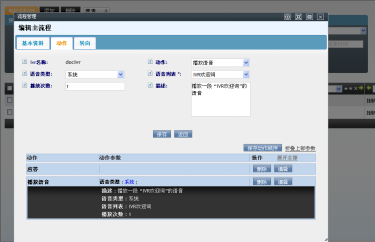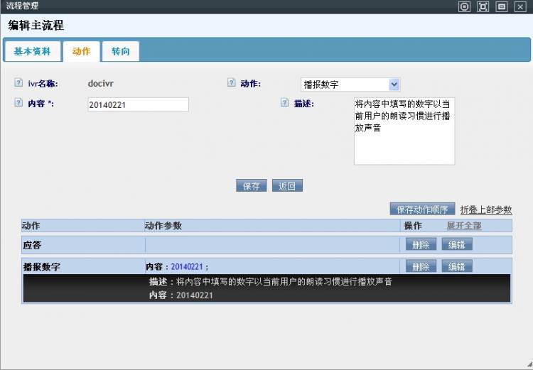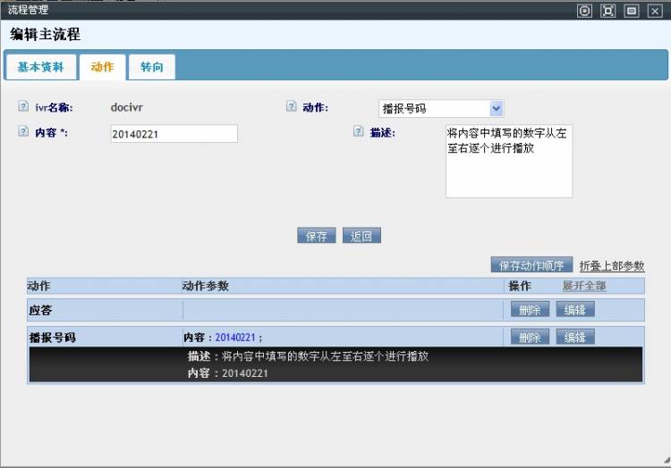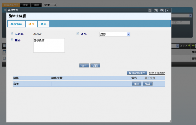 • 打开一个IVR流程的编辑界面,可以看到三个标签列表:基本资料、动作和转向。