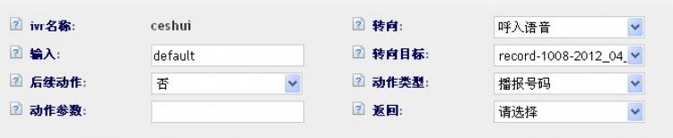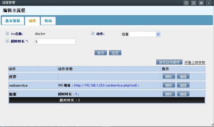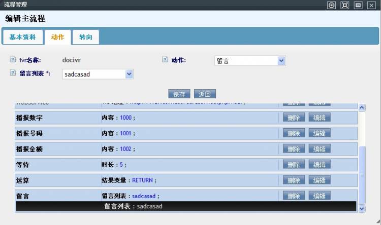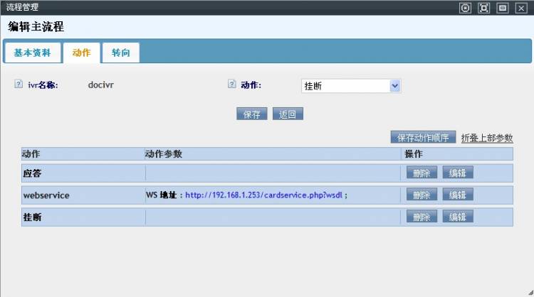 动作:可以通过下拉框为该IVR流程添加相关的动作.包括 应答,播放语音,放音收号,webservice,发送dtmf,播报数字,播报号码,播报金额,等待,运算,留言,忙线,阻塞,挂断,写文件,设置语言,读配置文件,发送传真