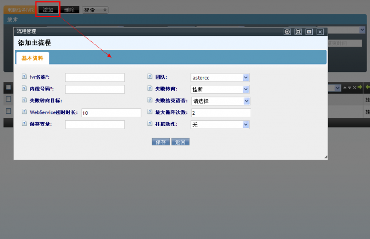 • 添加ivr主流程,一个主流程可包含多个子流程,只有主流程可作为ivr的初始入口,有独立的内线号码。
