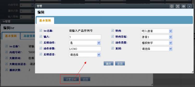 首先保存你这条ivr记录,然后在ivr列表中找到此记录,鼠标左键双击记录,打开ivr编辑界面,在编辑界面上点击【设置目标】按钮。