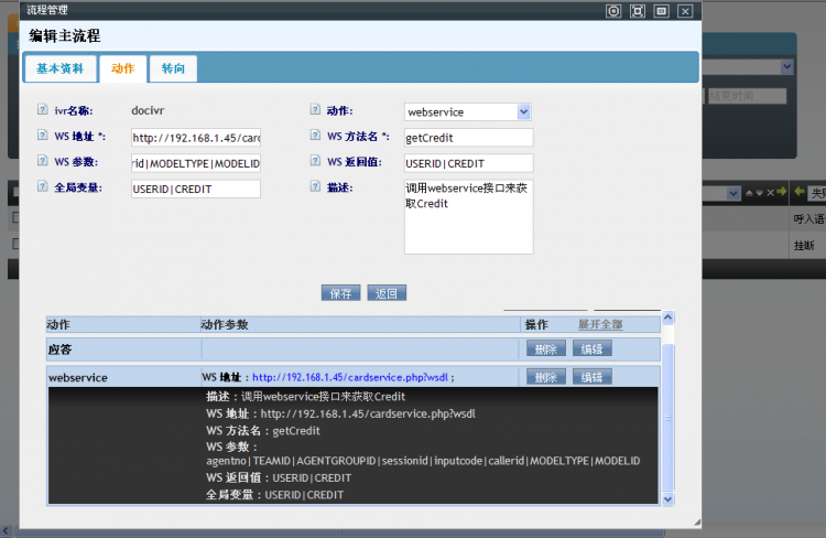 挂机动作 :客户在IVR流程中,挂机后将要执行的动作,可以选择webservice.