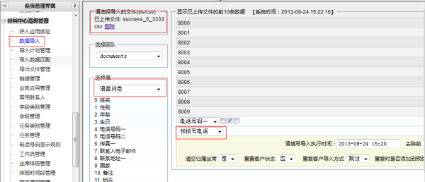 为预拨号导入号码,上传号码列表文件(逗号分隔的csv模式,utf8编码最佳),选择团队,选择上一步创建的外呼任务对应的客户包(选择表),在列表中选择相应列对应客户资料项目,在电话号码列下方选中预拨号电话(选中后号码才会进入预拨号列表),最后点击将数据导入表,生成导入计划。