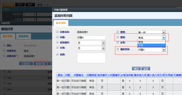 语音问卷中,只允许添加两种题型:单选题及文本题。 例如: 单选题,请为XXX服务评分,1为很差,2为一般,3为满意,4为非常满意 文本题,请为XXX服务评分,1到100分,100分为最高分。 与普通问卷相比,你需要为语音问卷的每道问题选择一条播放语音(即之前准备好并上传的语音文件)。 是否必答:在用户通过按键回答语音问卷时,如果第一遍播放某一问题时,用户没有输入答案或输入了一个不存在的答案,系统会再重复播放一遍本题语音,用户此时依然可以回答本题,但如果在第二次播放语音后,用户还是没有输入或输入了不存在的答案,那么系统将判断本题是否是必答题 ,如果是必答题,将挂本次问卷装以失败结束,如果不是改签是,将进入下一题。 设置好后,点击确定按钮即可增加一题。
