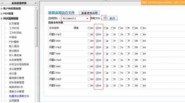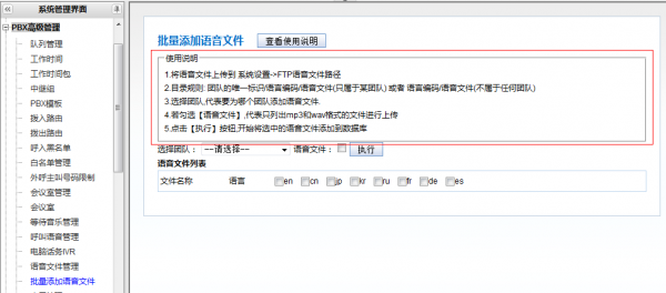 登录系统,进入pbx高级管理–>批量添加语音文件,依照使用说明逐步操作: