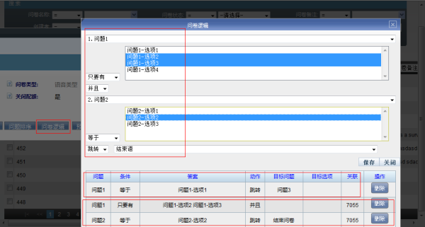 上图设置了两条逻辑跳转规则,一条是单条件跳转(本问题1选择了一选项1时,跳转到问题3),另一条是复合条件跳转(当问题1选择了选项2或3,并且问题2选择了答案2时,问卷结束)