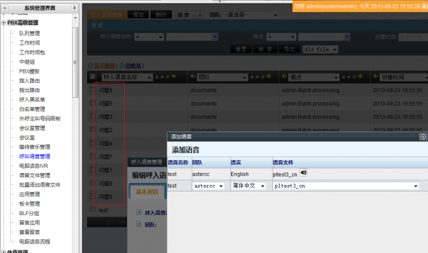 pbx高级管理/呼叫语音管理 页面查看上传的语音文件