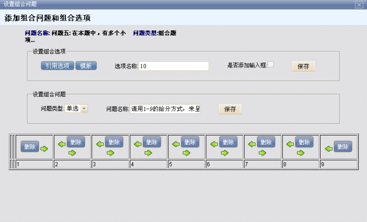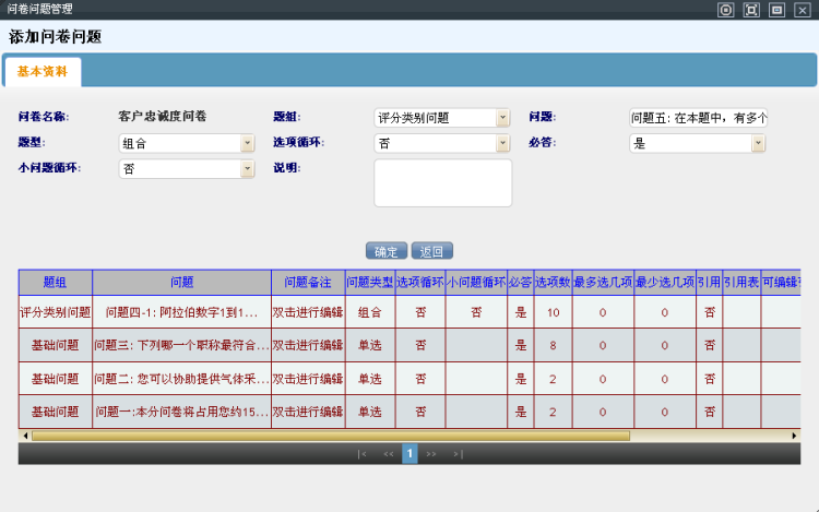 选项添加完成后返回到添加问卷问题界面,继续为该问卷添加问题,接下来我们了解一下组合题型的问题如何添加