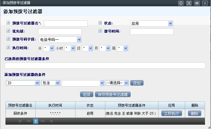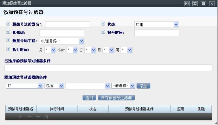 我们看到,执行时间后面有分、小时、日、月、周五个选择框,当所有的方框内都默认为“*”不进行选择的时候,那说明这个过滤器一直处于执行状态,对于预拨号列表里已经存在相同号码的客户将不会被导入
