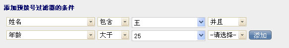 我想添加所有年龄大于25岁并且客户姓名包含姓王的客户,那么字段里选择“年龄”大于,输入“25”,在后面选择并且,选择字段为姓名,包含,王