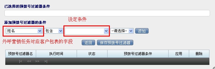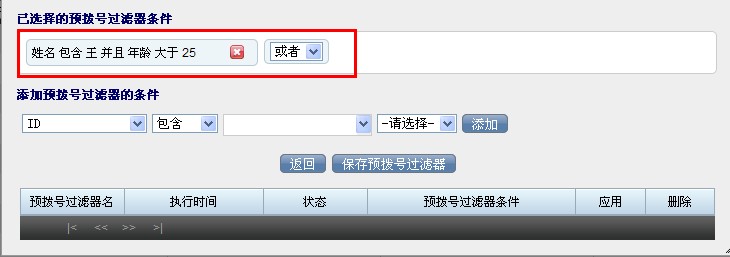 若您还想一并再添加其它条件,允许系统一并回收到预拨号列表中可以继续设定条件,添加条件,添加后的条件会在已选择的预拨号过滤条件中出现,保存后会在该界面下方表格中预览数据