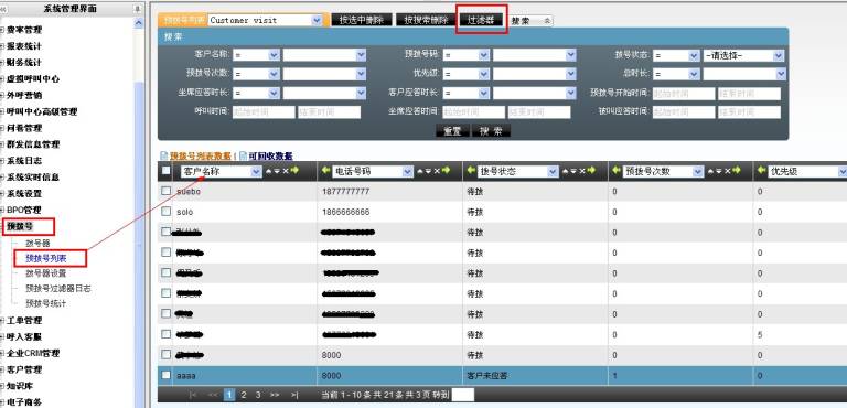 比如想把每天需要回访的客户数据,回收到预拨号列表中,建立一个过滤器,设定执行时间为 晚上某个时间 。搜索条件为 预约时间为当天 这样的搜索条件,每当晚上过滤器执行的时候,就会把第二天要回放的客户数据回收到预拨号列表中,当第二天上班的时候,需要回放的客户已经在预拨号列表中,只需要开启预拨号就可以,挺方便吧!